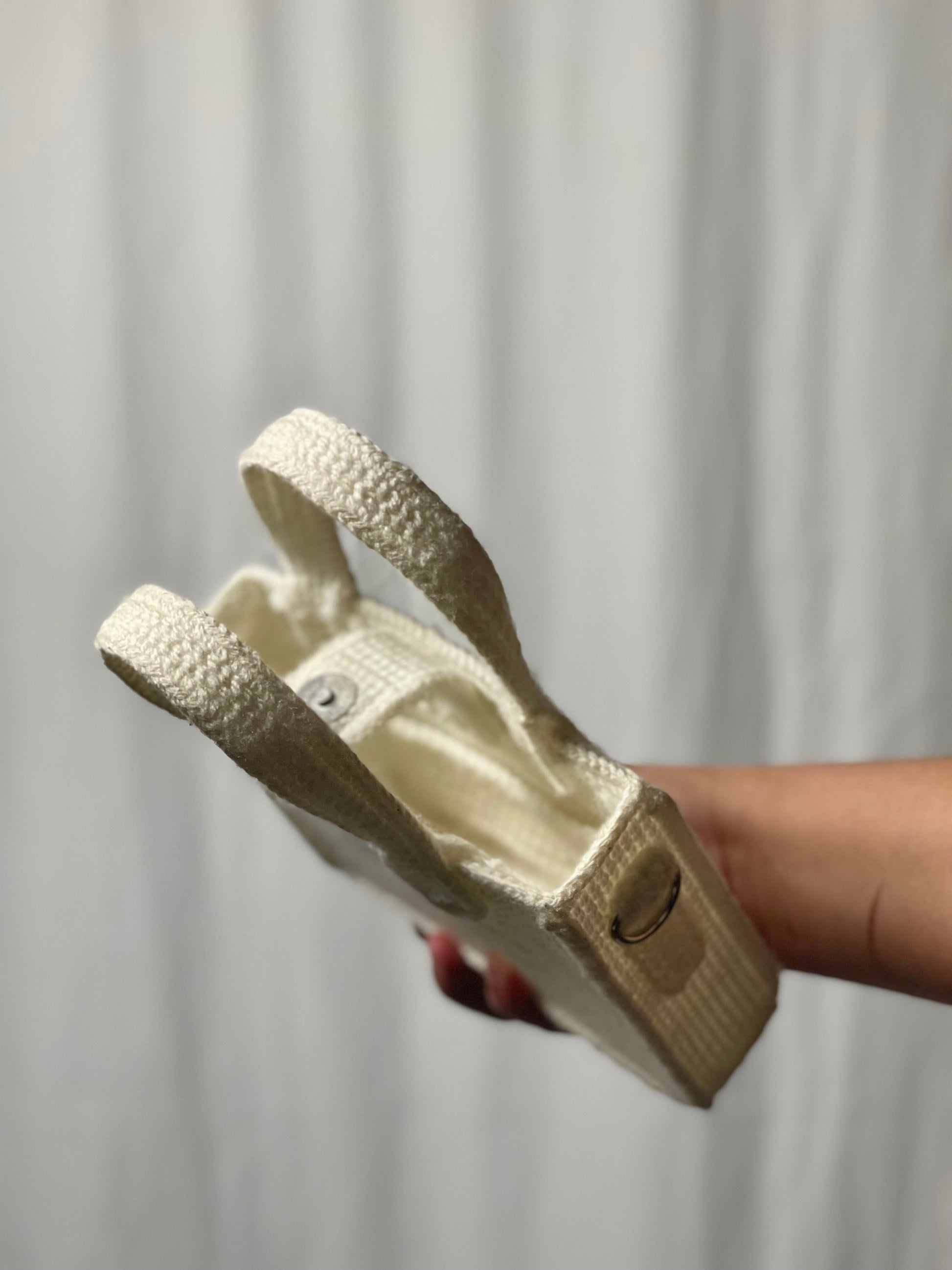 NYGC shoulder bag comprises of plastic structure, polyester ribbon, and metal clasp.