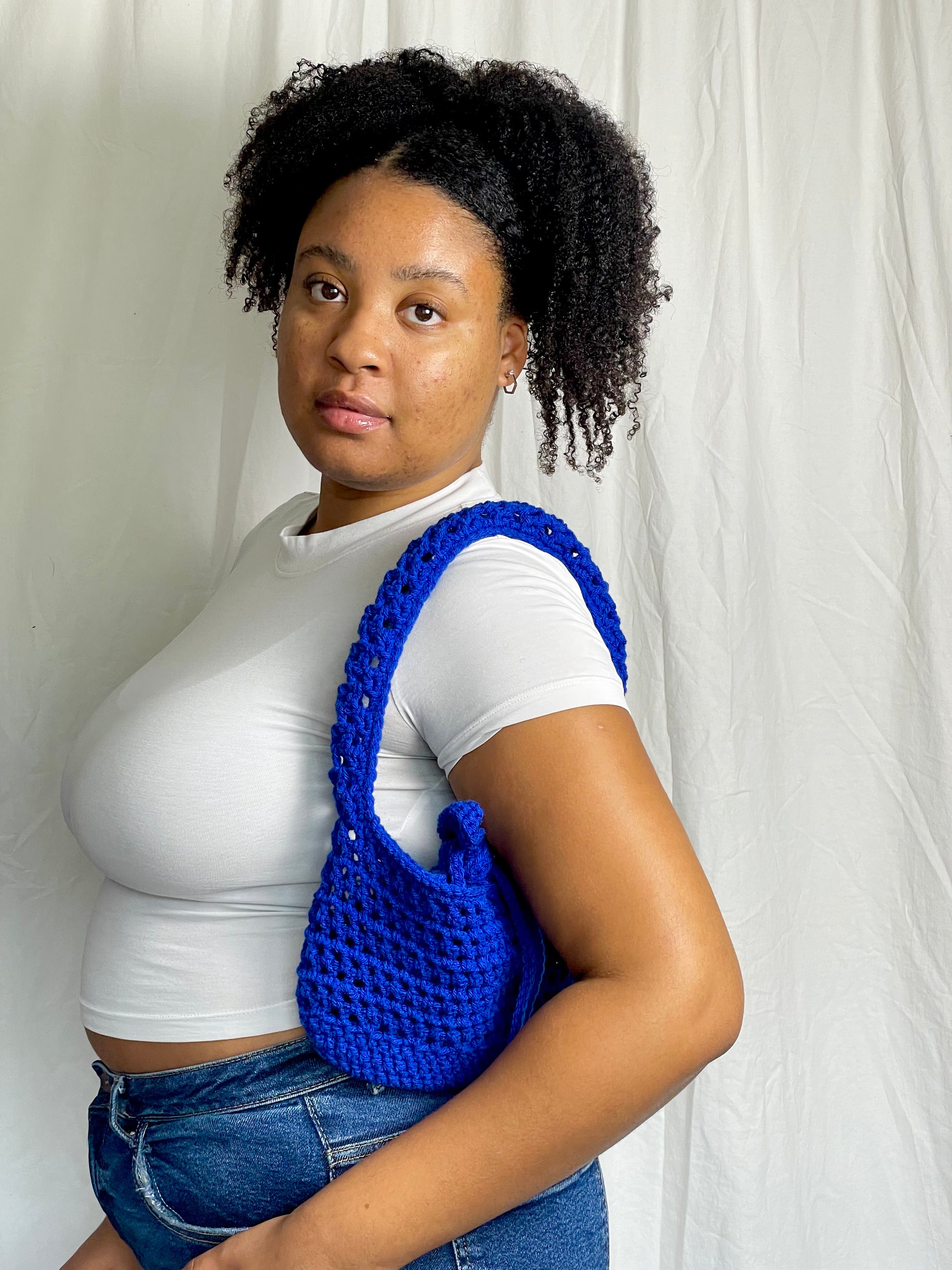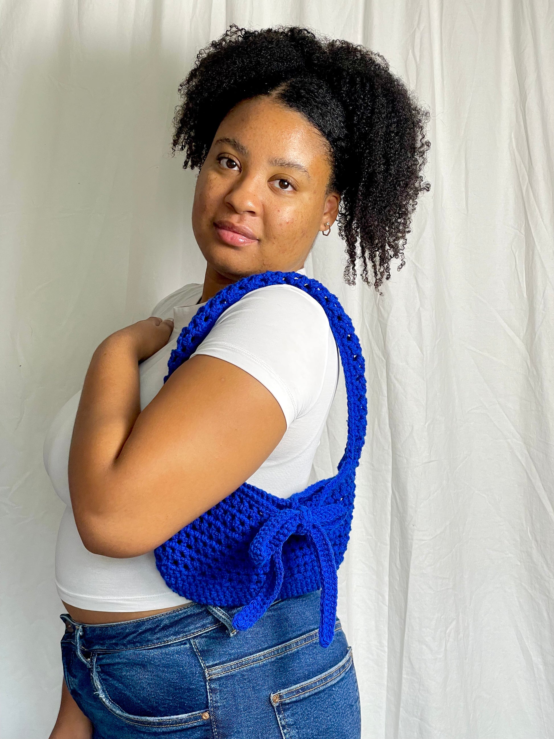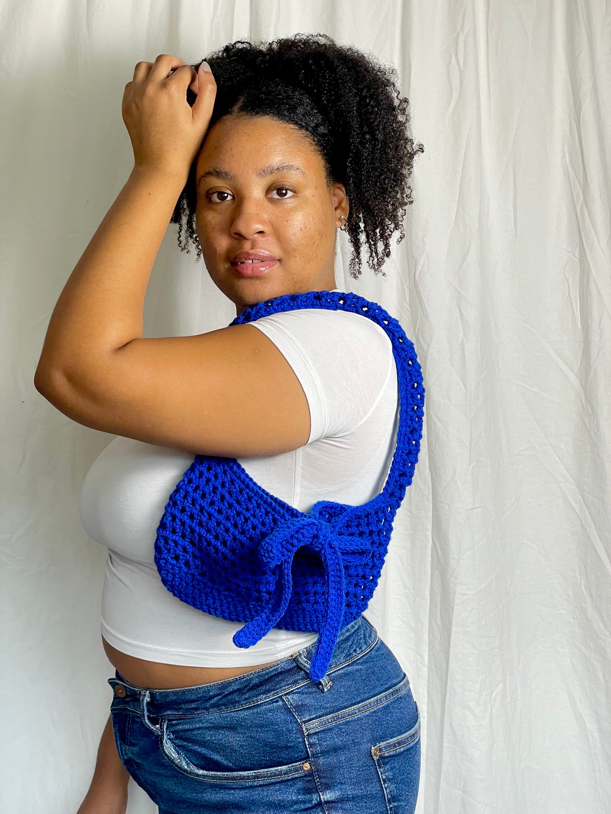 Mesh crochet shoulder bag with tie-able bow closure! Bag will stretch ever so slightly with use.