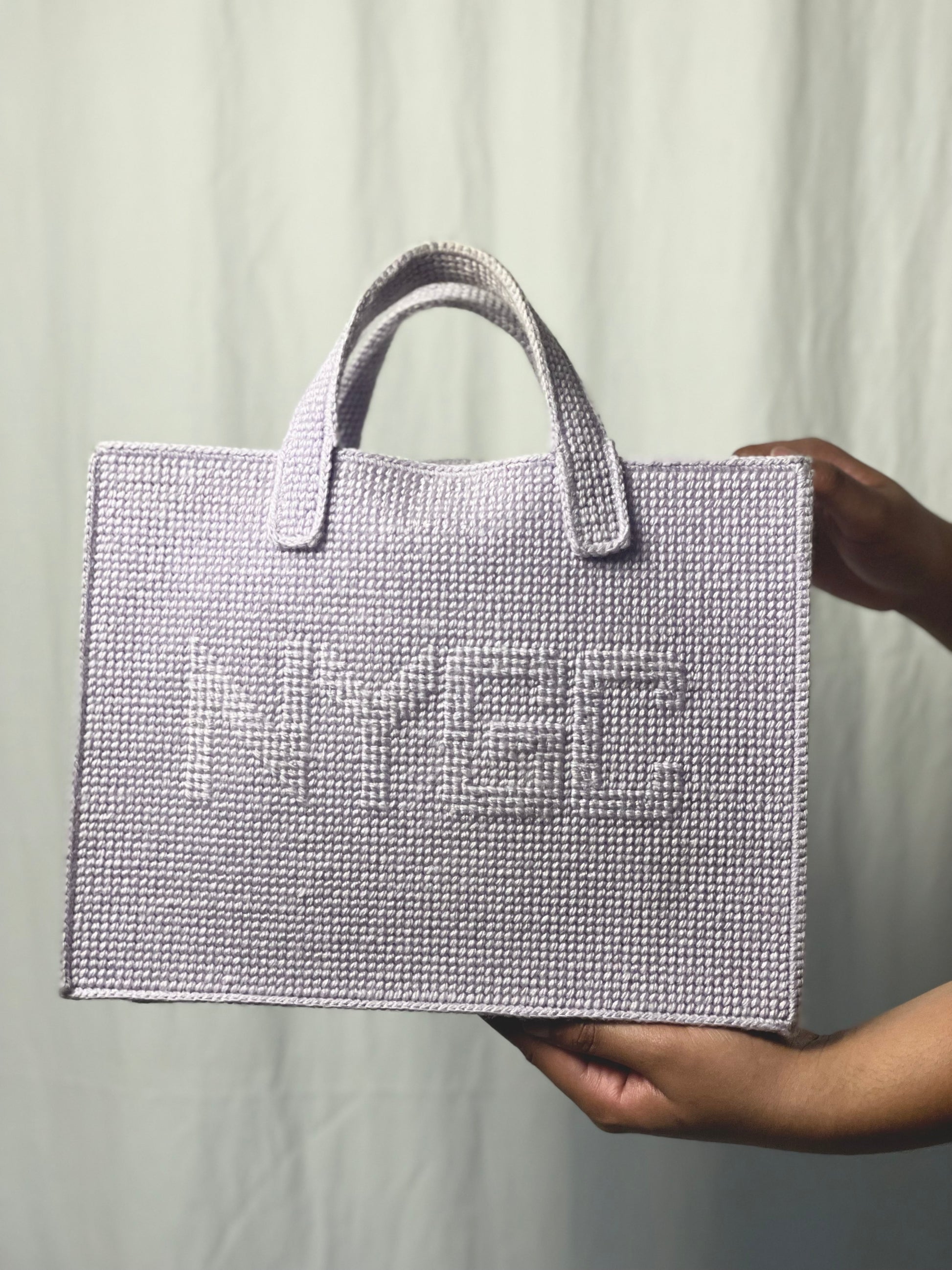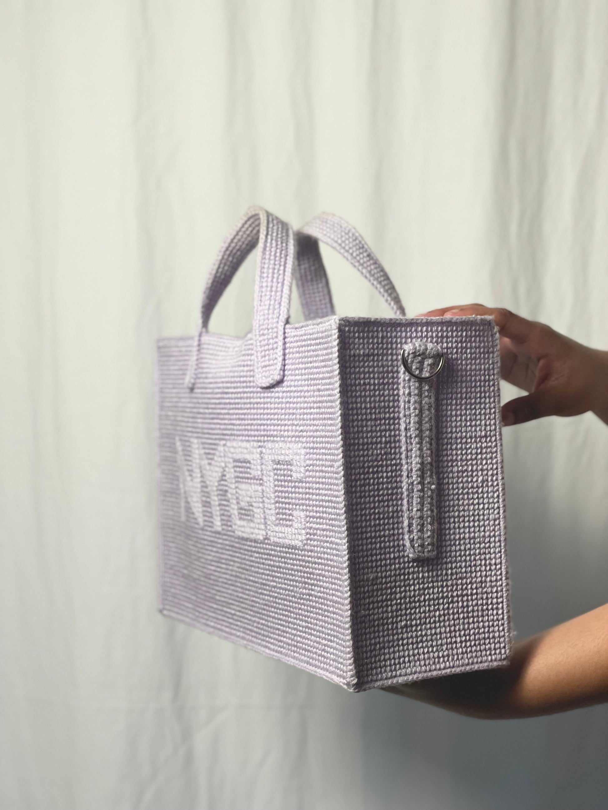 NYGC shoulder bag comprises of plastic structure, polyester ribbon, and metal clasp.