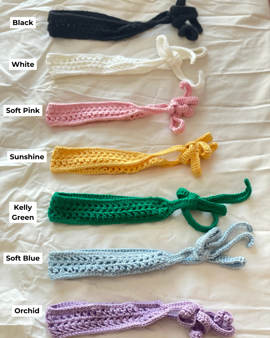 A simple crochet mesh inspired headband with tieable straps. Ships within 1-3 business days.