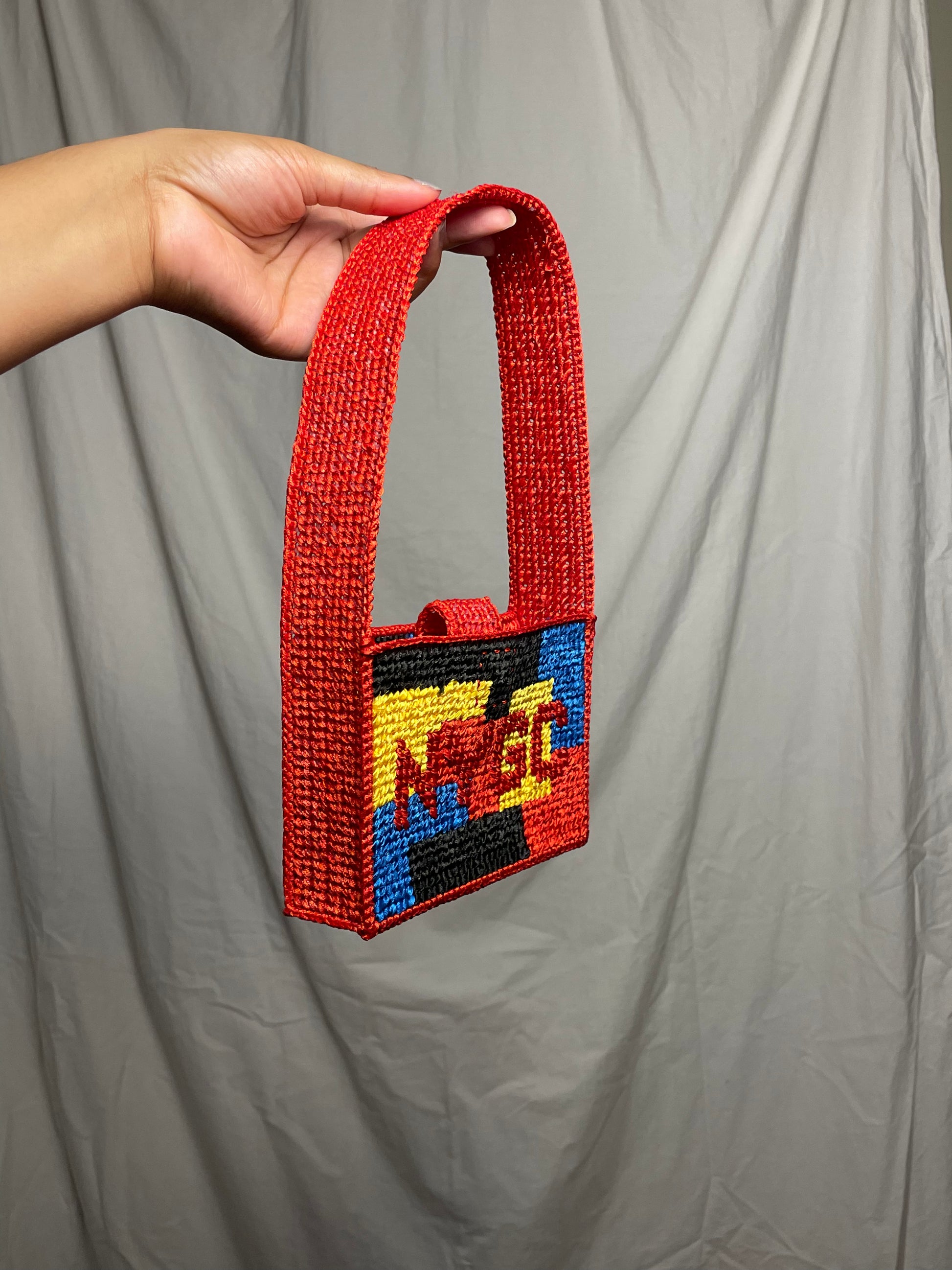 NYGC shoulder bag comprises of plastic structure, polyester ribbon, and metal clasp.