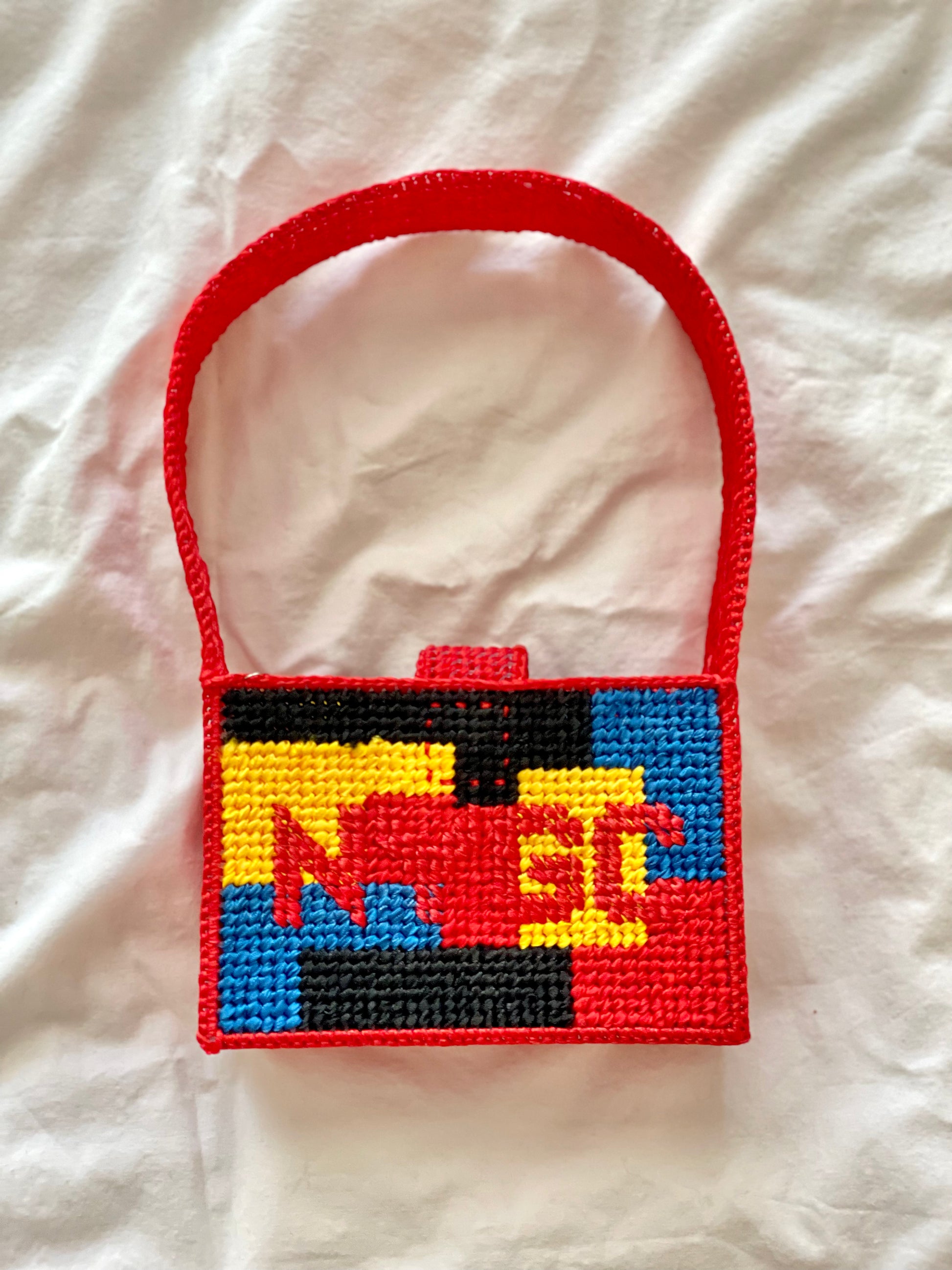 Crochet + Needlepoint shoulder bag with magnetic closure. This bag is a ready-to-ship sample. This sample bag is half an inch smaller and features no pocket. It ships within 1-3 business days.