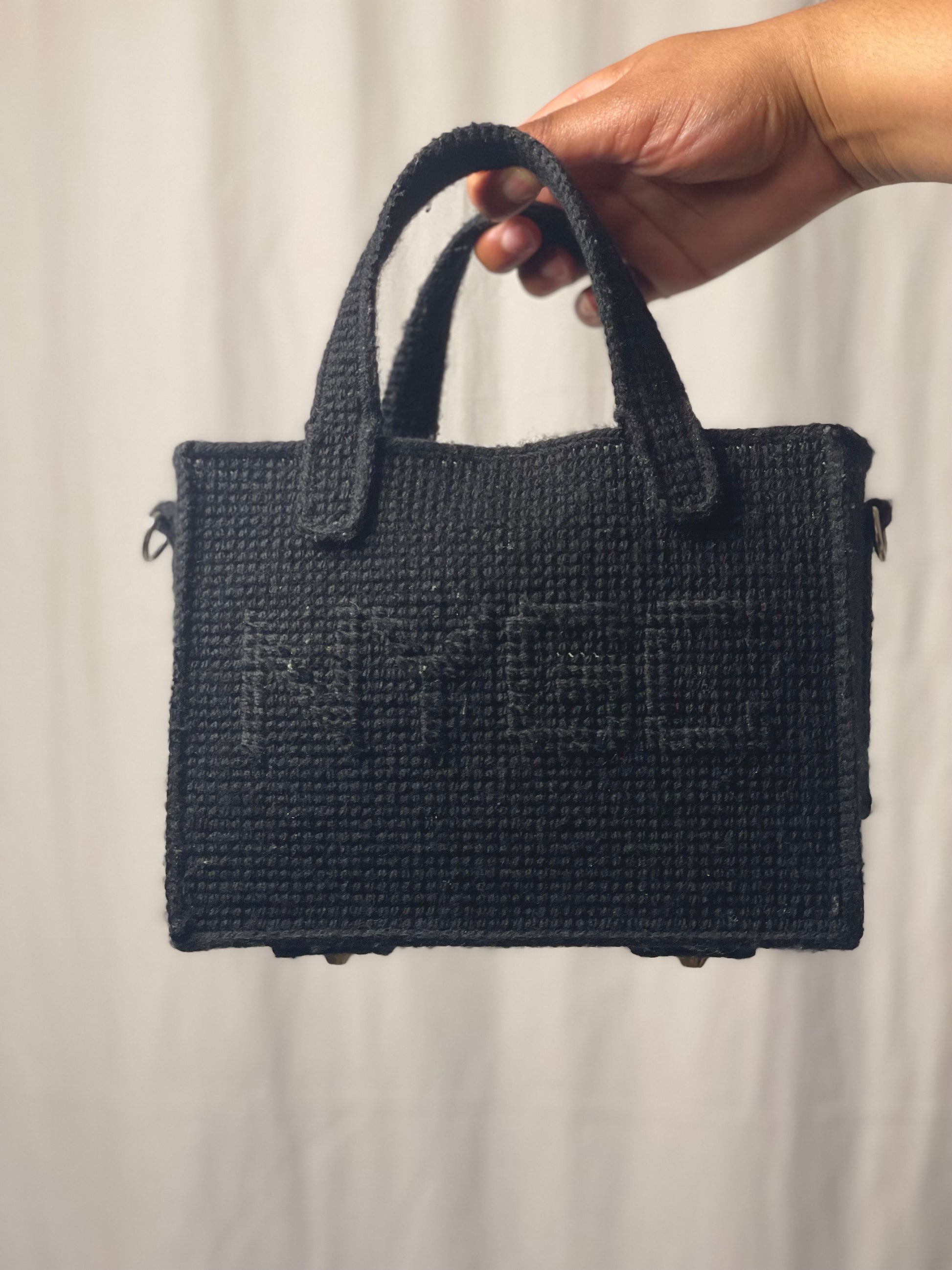 Plastic Canvas and crochet purse featuring a pocket, clasp closure, and silver hardware. Paired with the Debut Mini Skirt.